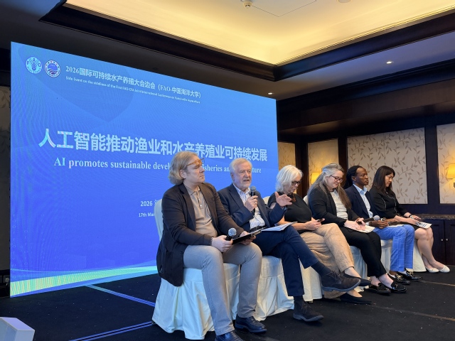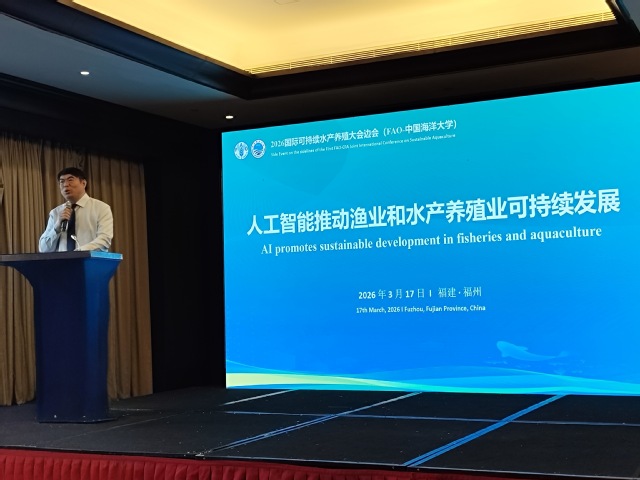 3月17日至20日,由中国渔业协会和联合国粮食及农业组织(FAO)共同主办的“2026国际可持续水产养殖大会”在福建福州举行。中国海洋大学群p 深度参与大会筹备与组织工作,并于3月17日与联合国粮食及农业组织联合举办“人工智能推动渔业和水产养殖业可持续发展”专题边会。学校副校长刘勇出席相关活动并致辞。学院院长艾庆辉主持本次边会。