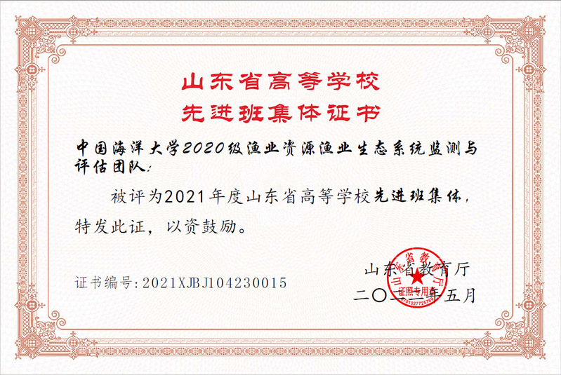 2022年4月24日,山东省教育厅发布了2021年度山东省高等学校优秀学生、优秀学生干部和先进班集体名单公示。其中,中国海洋大学2020级渔业资源生态系统监测与评估团队被评为2021年度山东省高等学校先进班集体。