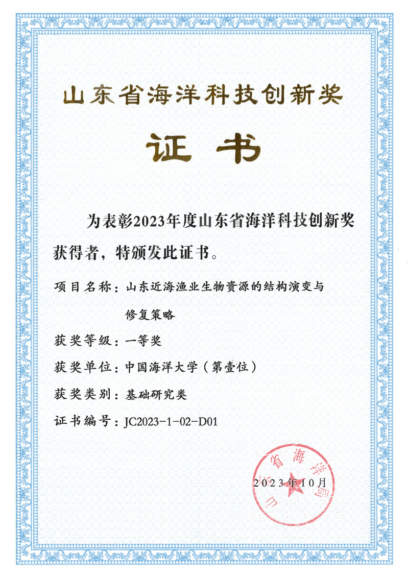 近日,山东省海洋局网站发布了《关于2023年度山东省海洋科技创新奖获奖成果和人选的公告》,中国海洋大学共获奖11项,其中作为第一完成单位荣获一等奖2项、二等奖5项、青年海洋科技奖1人。渔业生态系统监测与评估实验室的研究成果“山东近海渔业生物资源的结构演变与修复策略”荣获一等奖。
