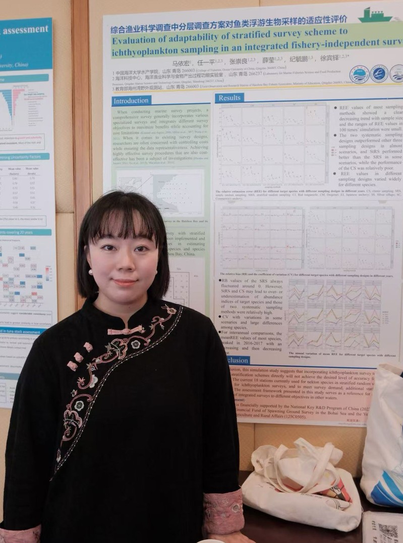 马依宏针对其研究内容进行了海报展示,重点介绍了将鱼类浮游生物采样纳入综合调查中的方法,并评估了现有调查设计的适宜性。以海州湾为例,马依宏博士提出了一种评估不同采样设计方法的框架,强调了定期评估调查设计有效性的必要性。研究所提出的评估框架可为其他海域综合调查的适应性评估提供参考,尤其是在针对不同目标时的应用。