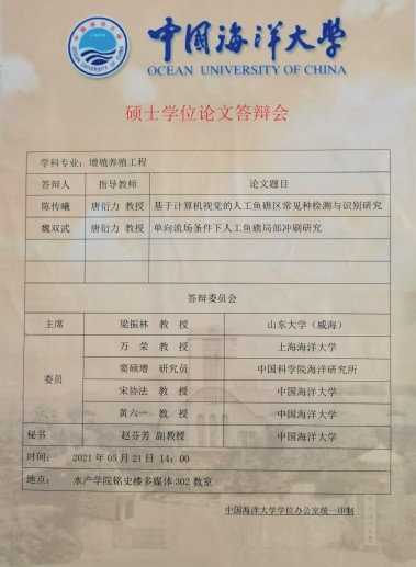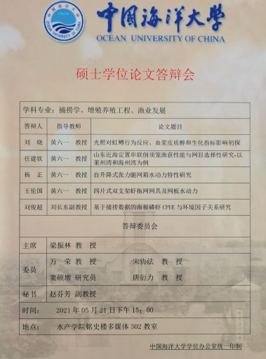 2021年5月21日下午,海洋渔业技术实验室在档案馆多媒体教室举行了2021届研究生毕业论文答辩。答辩委员会由山东大学威海分校海洋学院常务副院长梁振林教授、上海海洋大学校长万荣教授、中国科学研究院海洋研究所窦硕增研究员、中国海洋大学群p 副院长宋协法教授、中国海洋大学群p 唐衍力教授、中国海洋大学群p 渔业系主任黄六一教授组成,其中,梁振林教授担任答辩委员会主席。赵芬芳副教授担任答辩委员会秘书。